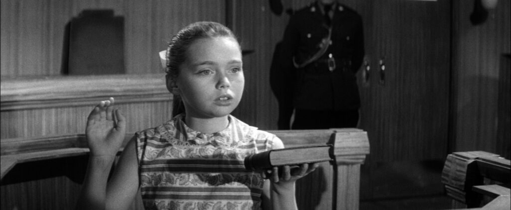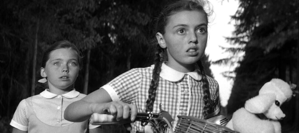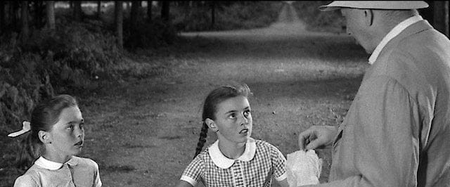 Ze współczesnej perspektywy figura Oldenberrego wciąż niepokoi, choć może też nieco bawić. Obserwujemy w tej roli Felixa Aylmera, aktora mającego wtedy za sobą choćby rolę Poloniusza w Hamlecie (1948) Laurence’a Oliviera i przewijającego się przez hollywoodzkie superprodukcje typu Quo Vadis (1951, Mervyn LeRoy) albo Ivanhoe (1952, Richard Thorpe). W Never Take Sweets from a Stranger jego pedofil jawi się jako postać żywcem wyjęta z filmu grozy. Nie wypowiada ani słowa, obleśnie się uśmiecha emanując perwersyjnym, prymitywnym złem. W finałowej sekwencji sunie przez las ku swoim ofiarom, trochę jak wilk goniący Czerwonego Kapturka, ale bardziej jak romerowski zombie albo osoba na której ciąży klątwa z It Follows (2014, David Robert Mitchell). Zatem interpretacja Aylmera jest zgoła odmienna od tej, którą dostrzegamy w kinie obecnie i która wydaje się zdecydowanie bliższa prawdy, kiedy to zwyrodnialec może wyglądać zupełnie przeciętnie (polecam w tym miejscu austriacki dramat Michael z 2011 roku [Markus Schleinzer, Kathrin Resetarits]), a czasem być nawet całkiem przystojny jak Patrick Wilson w Hard Candy (2005, David Slade).